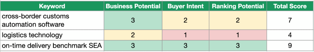 Instead of creating random blog posts, group your keywords into clusters. Each cluster is one buying theme (like WMS, freight visibility, or customs automation).
